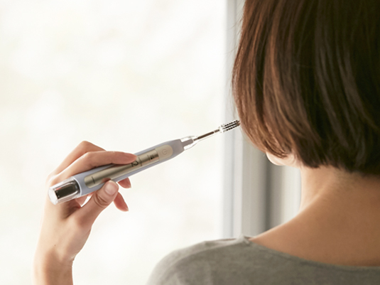 そこで活躍するのが電動歯ブラシ。ブラシの先端を歯に当てるだけで歯垢が取れるので、手みがきに比べてとても簡単で確実。ソラデーリズム2はブラッシング+光触媒作用によって歯垢を除去し、歯をつるつるにします。